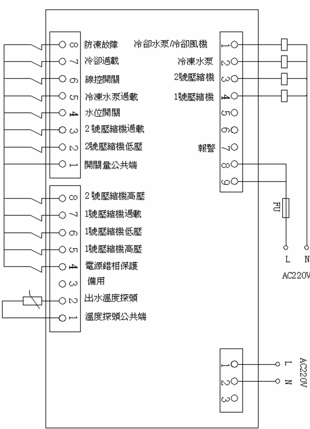 保護機組,當出現其中任何一種或幾種故障時, 停所有壓機和冷卻泵,冷凍泵不停 |