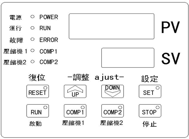 ②有2個壓縮機時:在升溫過程中,當顯示溫度>設定溫度時自動啟動1台壓縮機,當顯示溫度≥設定溫度+溫差時自動啟動2台壓縮機,在降溫過程中,當顯示溫度<設定溫度時,自動停止一台,當顯示溫度<設定溫度-溫差時全停止。